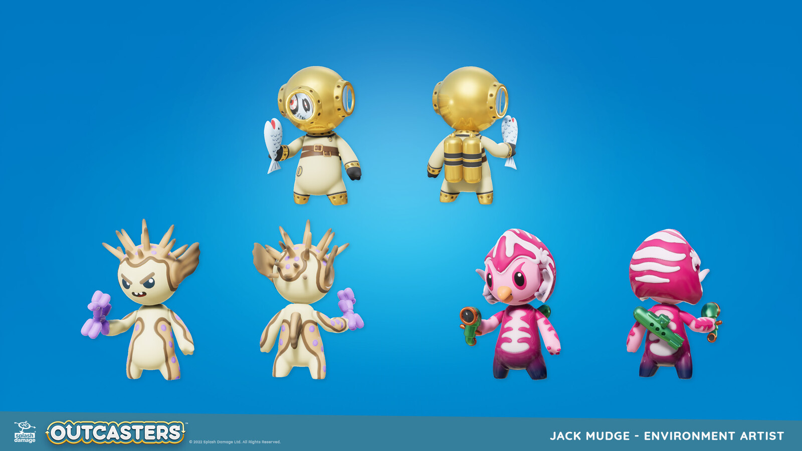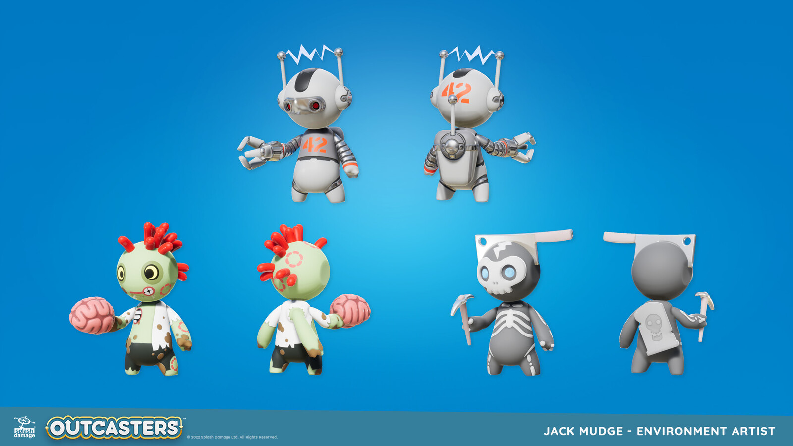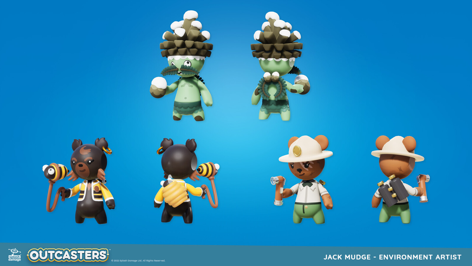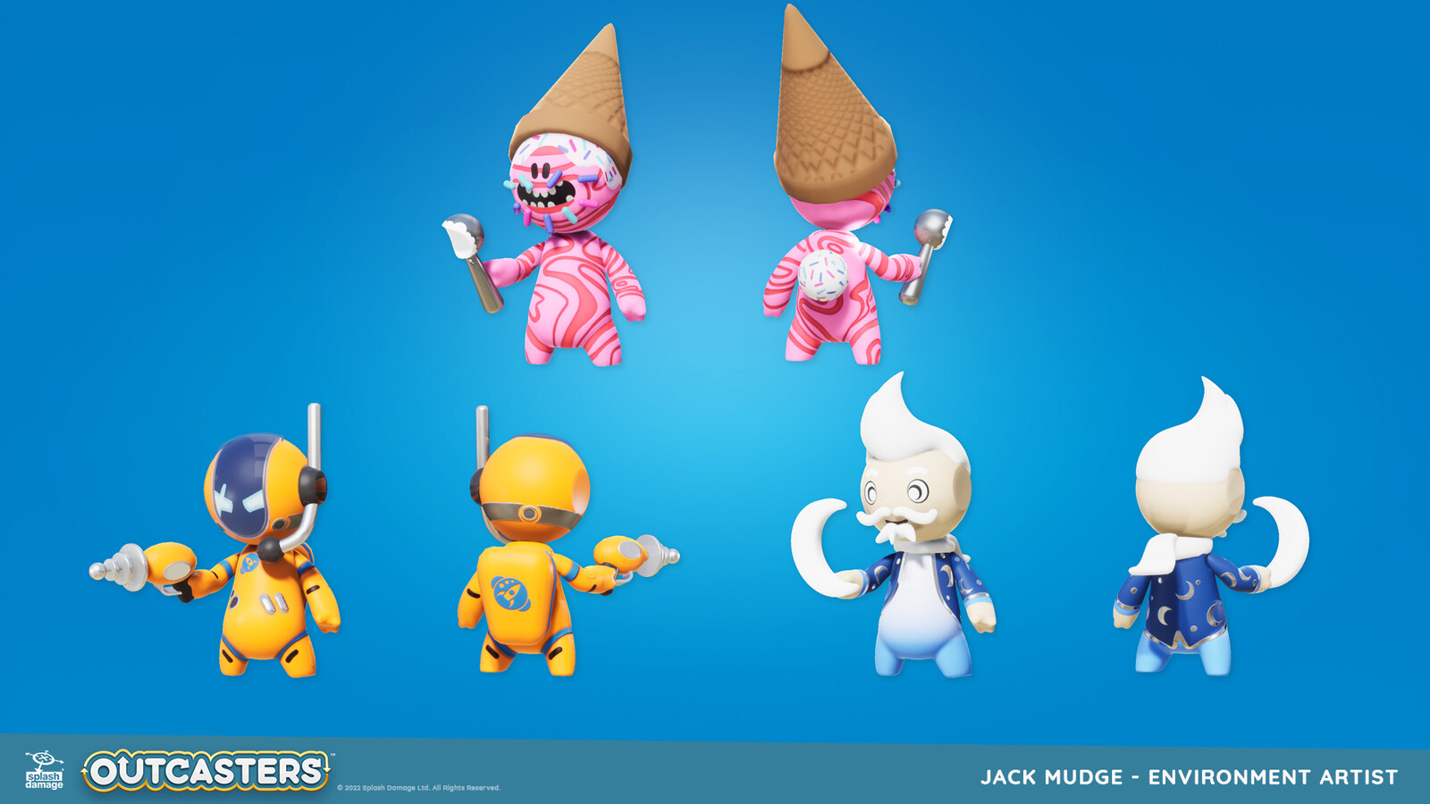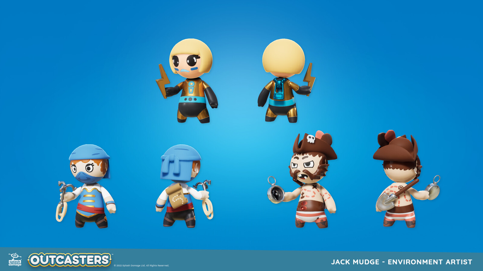We were a tiny team on Outcasters, so I had the opportunity to work with my generalist skillset. I created our characters' base form, which was used across all sets. I also built a wide range of accessories to allow their personalities to shine!